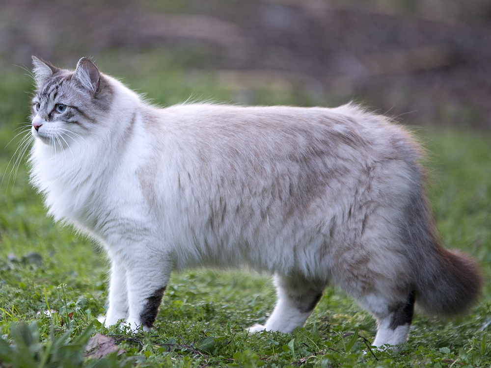It has a long body that is solid-boned and supported by thick legs that end in strong yet short paws. The feet are notably white, as if wearing socks. Its tail is very bushy but proportionate to the rest of its frame. As such, this kitty has a rather balanced look.