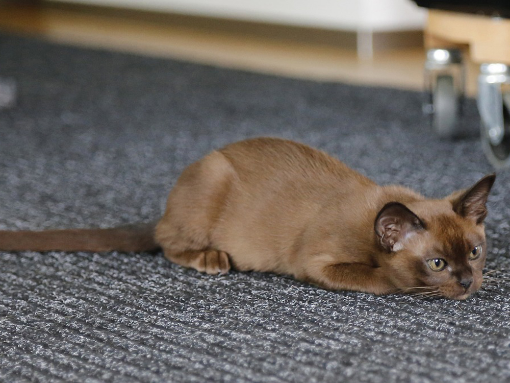 The Burmese’s short-haired, silky coat has a glossy finish and solid colour, save for its underparts. It has a triangular head with a rounded top and ears that are rounded at the ends, like its head. Its striking eyes, large and soulful-looking, can range from amber to yellow colour. With slender legs that are longer in the back than the front ones, the Burmese has small oval-shaped paws and a straight tail.
