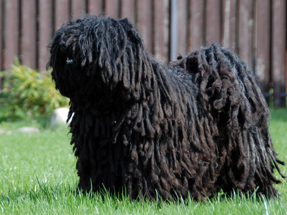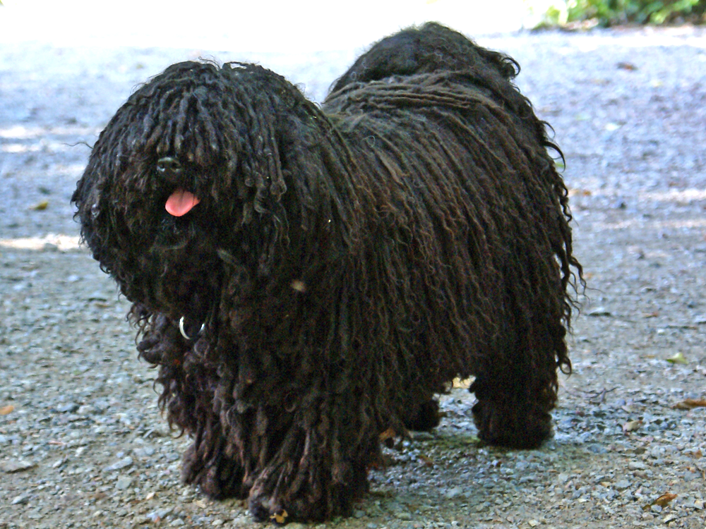 The Hungarian Puli is a dog that is hard to miss thanks to its ultra-thick corded coat. Weighing 22 to 29 pounds and standing 37 to 44 centimetres at the withers, this mop-like dog is actually well-muscled and sturdy. Hair fully covers its dark brown eyes from view, which have a lively expression. It has medium pendant, v-shaped ears, large black nose, black tight lips, and a perfect scissor bite.
