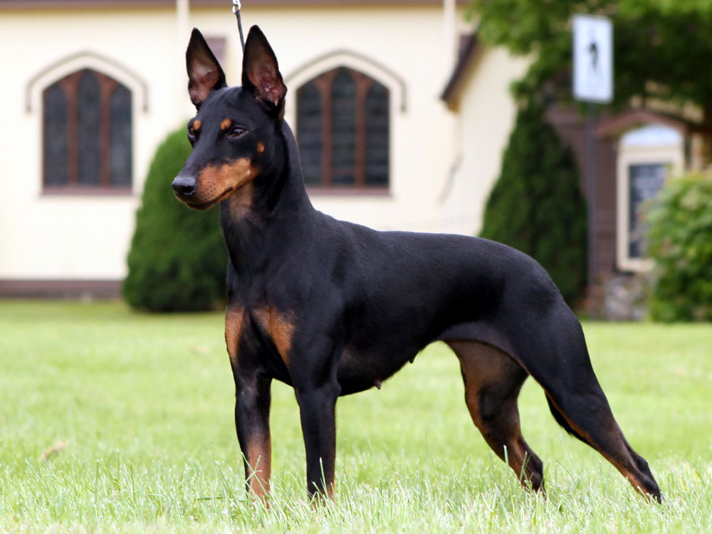 The Manchester Terriers resembles a miniature Doberman Pinscher with the muzzle tapering to the nose, and small, almond-shaped eyes that are dark in colour. It also has small V-shaped ears that hang close to its heads, slightly long neck and arched back, completing its noble look.